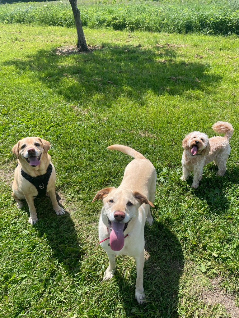 Harley & Jess the Labradors and Benji the Cavapoo are always so happy to see each other when they get together bi-weekly for their group walk. They are all from one dog households, so get to enjoy the companionship of other dogs on their walks with us regularly.